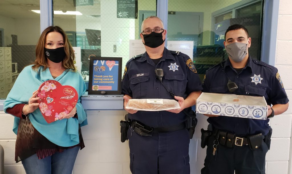 The Abingdon Ruritan Club has several members who love to bake. So it was a perfect idea the club’s Public Service Committee came up with to donate Valentine’s Day baked goods to the county’s first responders as a small token of appreciation for all their hard work. Members donated dozens of treats, including cakes, candy, cookies, cupcakes and truffles, that were delivered to the county’s 911 center, Gloucester County Sheriff’s Office and Abingdon Volunteer Fire and Rescue Station 3 on Friday. In top photo, ARC Public Service Committee member Regina Scott presents Lt. Robert Taylor (center) and Deputy Brandon Collins with some of the many treats donated by members. Below, members of AVFR Station 3 happily received baked goods donations presented by ARC Public Service Committee member Virginia Glass (second from right). Station members pictured are, from left, David Yoder, Austin Hedrick, Amy Whittaker and Derek Milam (far right)....