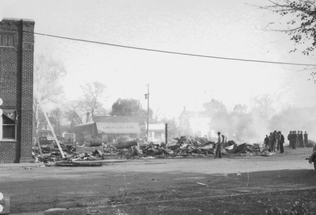 Mathews Court House suffered three devastating fires in a 21-year period in the 20th century, before organized fire protection was available. Top left left, a scene from after the fire in 1921; at right, after a fire in 1926; below left, the fire of 1942. Large swaths of commercial property were wiped out in each blaze, and only bucket brigades and chemical trucks were available to check the progress of the flames.