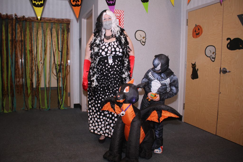 Gloucester Library, Main Street Center, hosted its “Boo Bash” on Saturday morning, an event that included Halloween activities, refreshments, crafts and games. Here, library specialist Sissi Mise (dressed as Cruella de Vil) is shown with 7-year-old Eddie Johnston (dressed as Venom), who hitched a ride on a dragon....