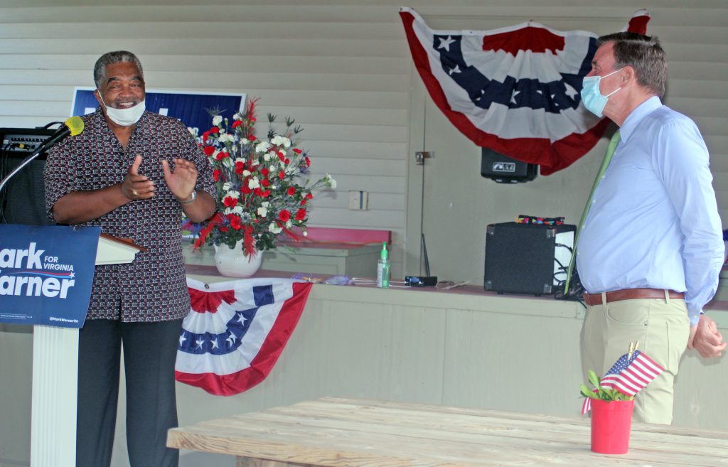 U.S. Sen. Mark Warner (D-Virginia) held a meet-and-greet event on Friday afternoon with supporters at The First United Baptist Church in Gloucester. The outside event was held with social distancing, masks and other safety protocols in place. In Virginia, Warner said, we have the tendency to say hyperbolically that every election is the most important, but this year, he said “is the most important election in my lifetime.” At stake, he said, is “what kind of America are we going to have … the heart and soul of who we are as a country is at stake.” Warner is opposed in his reelection bid by Republican hopeful Daniel Gade, who made campaign stops on Aug. 29 in Gloucester and Mathews counties. Above, Pastor E. Randolph Graham of First United introduced Warner at the ceremony. Below, before Warner took the stage, he exchanged elbow bumps with supporters and stopped to take a few masked selfies, including this one with the Rev. Darlene Ward, at left, and Gwenda Fay Graham....