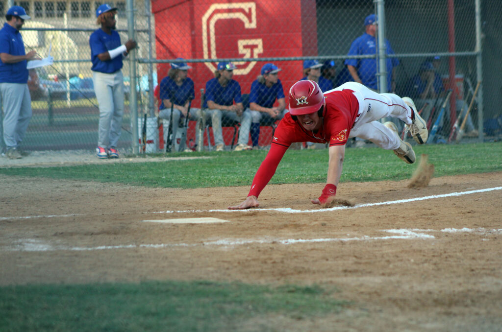 The Gloucester High School varsity softball and baseball teams celebrated double wins in the Class 4 Region A final last week, but both teams ended their seasons Tuesday night in their respective state quarterfinal games. Hayden Simmons is shown here becoming airborne as he slides into home during Tuesday night’s game. See story in the sports section....