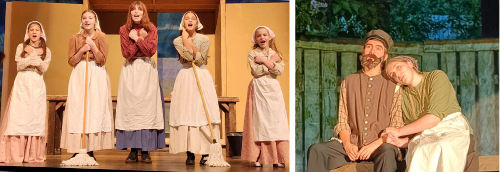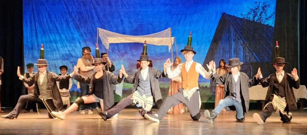 “Fiddler on the Roof JR,” a production of the Court House Players, will be performed this Friday and Saturday at 7 p.m. and Sunday at 3 p.m. in the Harry M. Ward Auditorium at Mathews High School. Featuring a cast of over three dozen local youth, the musical drama reprises many of the beloved songs from the original Broadway version of the show, including “Sunrise, Sunset” and “If I Were a Rich Man.” Tickets are $12 for adults and $7 for students at the door. Shown above doing a traditional wedding dance, the Bottle Dance, are, front row from left, Cora Congrove, Layla Thomas, Johnathan Kubeczka, Joshua Littlefield, James West, and Andrew King; back row, William Shinn, Paul West, Kahlan Lindsay, Calem Fleming, Annabella Thomas, and Valerie Brandenberger. Below, Tevye’s five daughters, from left, portrayed by Valerie Brandenberger, Summer Day, Addison Morgan, Rylee Amaral, and Annabella Thomas, sing about their wish for husbands in “Matchmaker.” At bottom, Van Hutchins as Tevye and Rebbekah Thomas as his wife Golde sing “Do You Love Me?”