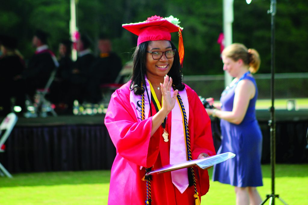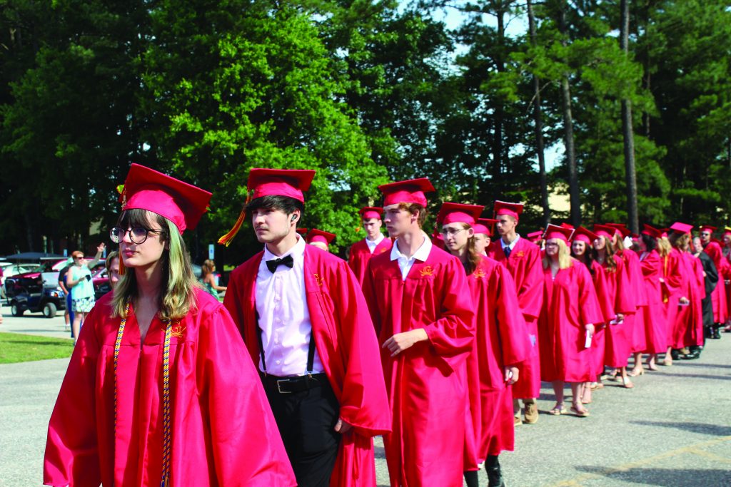Newly graduated Kylee Wicker cannot help but to smile from ear to ear at Saturday’s Gloucester High School graduation ceremony. At right, GHS seniors proceed to the athletic field at the start of the program.