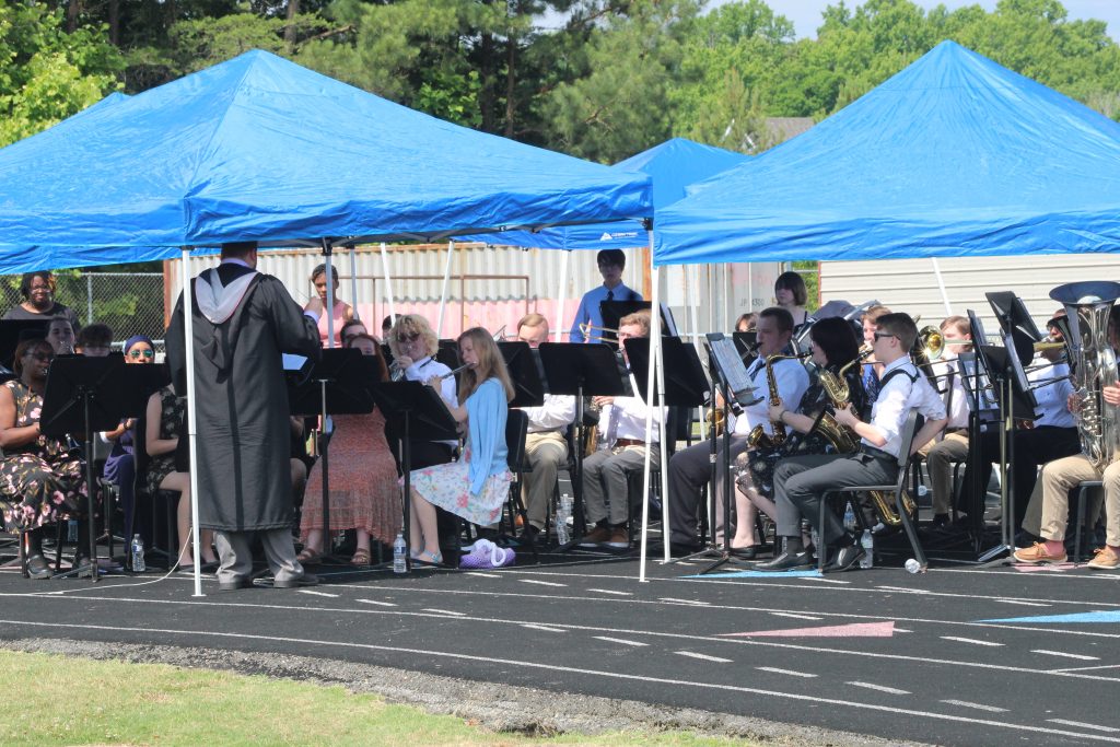 Tyler Bagent smiles as he takes his first look at his GHS diploma. At right, the GHS Combined Band played during the processional and recessional at graduation.