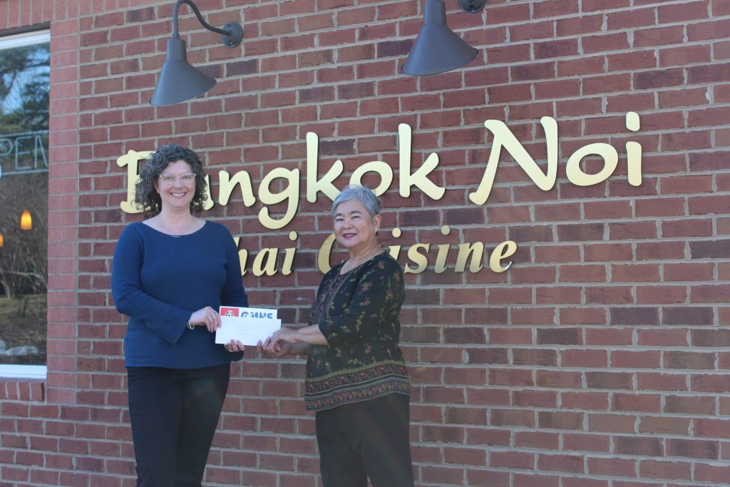 Bangkok Noi Thai Cuisine owner Tusnee McDaniel, at right, recently presented a $2,300 donation to Gloucester-Mathews Humane Society CEO April Martinez in support of the animal shelter....