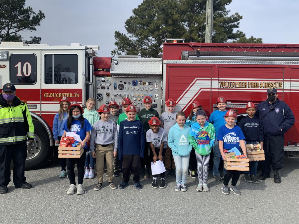 Ware Academy participated in the Great Kindness Challenge (Jan. 24-29). Students were tasked with random acts of kindness such as making a new friend, writing a thank-you note, or doing a good deed for the community. Audri Williams’s fourth-grade class contributed to gift baskets that were donated to Gloucester Volunteer Fire and Rescue Squad. Receiving the baskets were fire prevention officer Lt. Tony Villani (at far right) and assistant fire prevention officer Tony Saccaro, at left. Students pictured making the gift were, back row from left, Reylan Miltenberger, Piper Ward, Dominic Williams, Landon Williams, Greyson Dehoux, Marshall Hudgins, Isabelle Ruggiero, Chase Murphy, Micah Billups; front row, Katie Ly, Dominic Rainville, Luke Masiak, Gracen Billups, Lanie Peter, Arabella Thorne and Piper Ames....