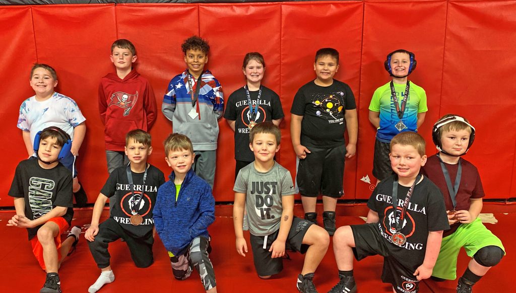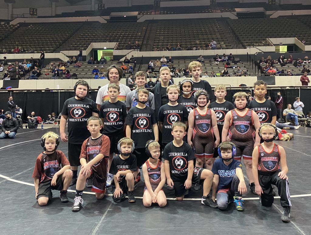 Members of Guerrilla Youth Wrestling competed in the Battle at the Bridge Youth Wrestling Tournament at Great Bridge High School on Jan. 9. Taking part in the competition (in top photo) were, front row from left, Bryce LeTennier, Henry Carpenter, Lincoln Grosskreuz, Caleb Briggs, Tucker Isaksen, Eddie Johnston; back row, Thomas Kampmann, Carter Symonds, Dominik Sales, Charlotte Carlisle, Alex Burns, Matthew Noehl and, not pictured, William Walker, Hayden Fox, Tyler Hawkey, Allison Farnsworth, Jaxon Kociumbas, Cason Zimmerman, Evan Zimmerman, Paul Williams, Camden Pluim, Hunter Young, Seth Thompson, Maliki Reaves, Paul Williams. Below, the team took part Sunday in the Virginia Duals kids’ tournament at the Hampton Coliseum. Those competing (and their places in the tournament) were, front row from left, Grayson Wiktorksi (third), Noehl (sixth), Ashton Ames (third), Grosskreuz (second), Briggs (sixth), Gavin Skay (fifth), Farnsworth (fifth); middle row, James Balduf (third), Symonds (four...