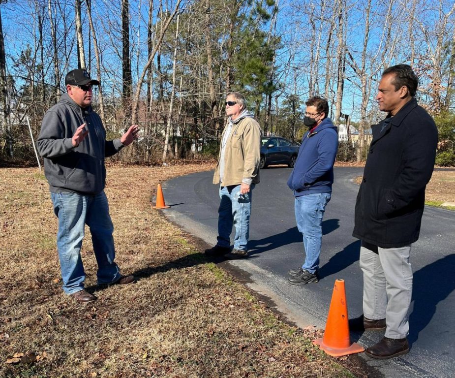 Representatives for FCI Towers, the Virginia Beach-based company selected to build two communications towers in Mathews to enhance broadband capabilities and cellular coverage, were in Mathews on Tuesday to do site surveys of Mathews Volunteer Rescue Squad on Cricket Hill Road and Mathews Volunteer Fire Department Station 2 on East River Road in order to determine where the towers will be located. Shown at the rescue squad building, from left in above photo, are FCI vice president Jason Hamill, Mathews Broadband Advisory Board vice chairman Willie Love, Gaurav Singh Mukati of Allpro Engineering, a company that does construction drawings, and Broadband Telecom president Jeff Beekhoo, who is the county’s broadband consultant. In photo at right, taken at Station 2, Love, MVRS president Scott Bergman, Singh Mukati, and MVFD Station 2 Captain Lee Smith, clockwise from left, examine survey drawings. Beekhoo and Hamill are in the background....