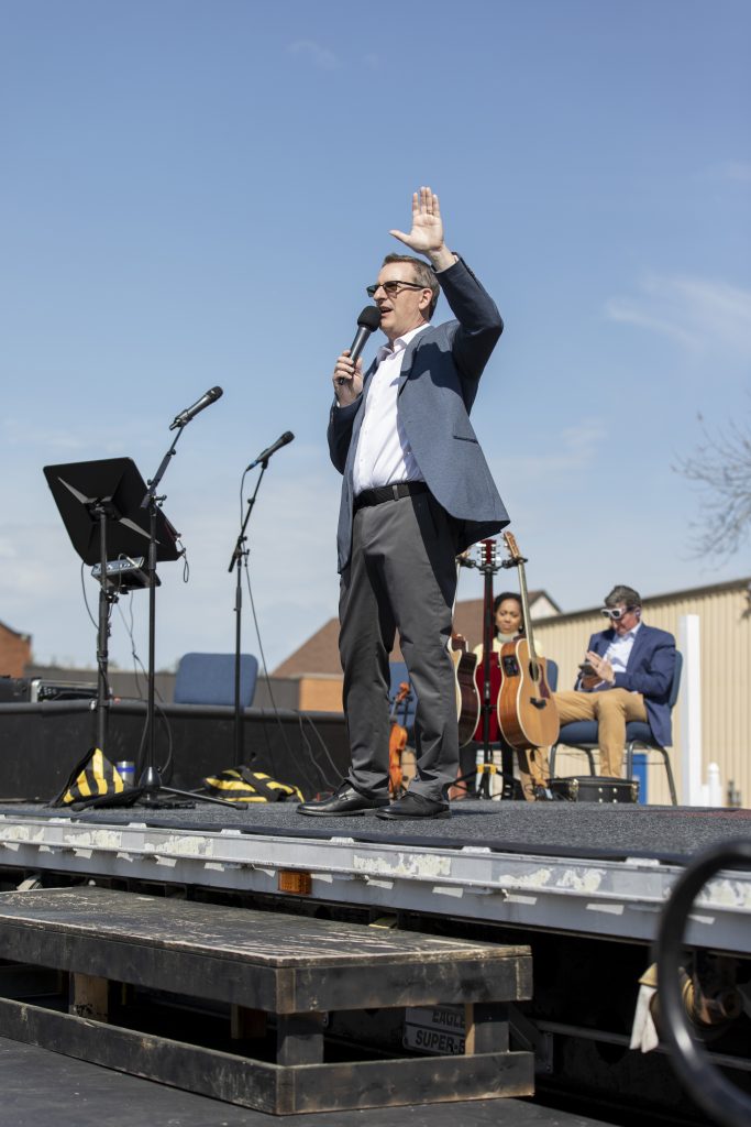 The Rev. Ken Cramer delivers the Easter message to the LightHouse church congregation in the parking lot.