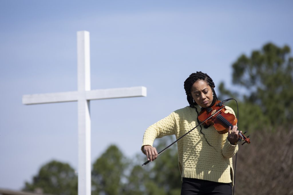 LightHouse Church at Ordinary figured out a way to hold an Easter service for a crowd while maintaining social distance: a drive-in service. Sound was provided by large speakers and also through vehicle radios. At left, Bethany Davis plays a violin selection; right, the spaced-out vehicles and the stage. Several local churches tried the drive-up arrangement for one of the most meaningful services of the Christian year.
