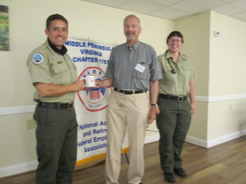 Bob Howe, center, president of the Middle Peninsula chapter of the National Association of Retired Federal Employees, presents a NARFE mug to Terry Sims and Emily Harlan of the Virginia Department of Conservation and Recreation, who gave a program on Machicomoco State Park at the Aug. 17 NARFE meeting and luncheon at Olivia’s in the Village, Gloucester.