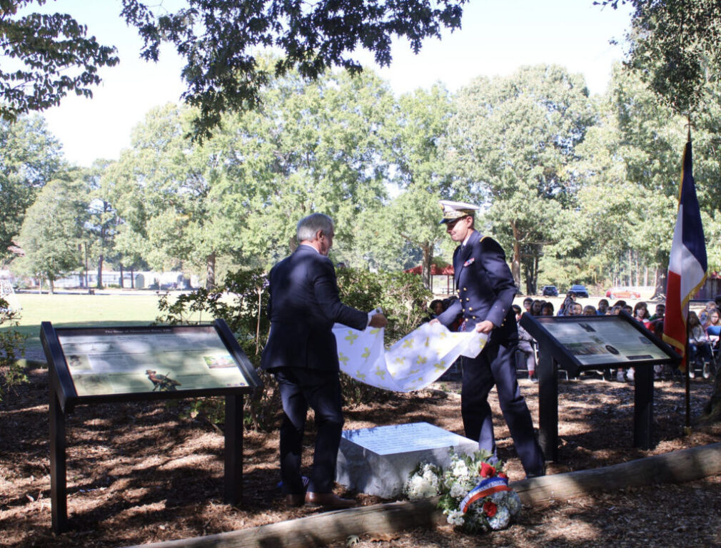 The American Society of the Le Souvenir Français Inc. dedicated a granite memorial honoring the French soldiers who made the ultimate sacrifice at the 1781 Battle of the Hook, on Friday afternoon at Abingdon Elementary School.