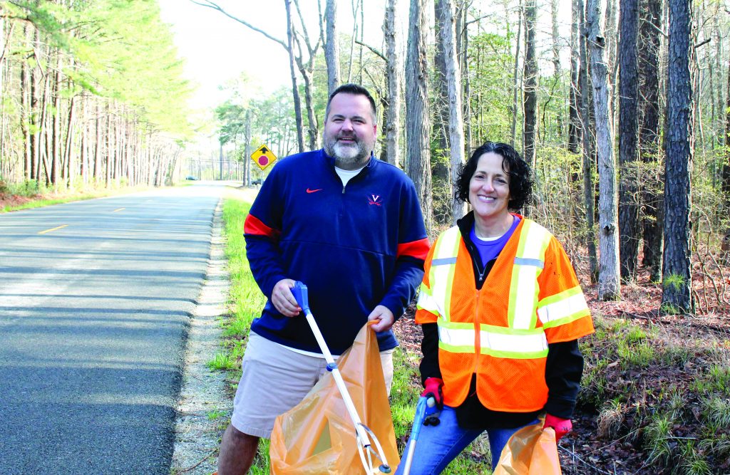 The Mathews Spring Cleanup was held on Saturday along various roads throughout the county. Here, Democrats Mark and Janet Deschak, at left, were assigned to clean up one end of the portion of Glebe Road between Church Street and Buckley Hall Road, while Republicans Jonathan Putt and Arlene Armentor were assigned to clean up the other end. “I told them to meet in the middle,” said Steve Pope with a laugh. Pope is the clean community coordinator for the Mathews Visitor and Information Center, which organized the event.