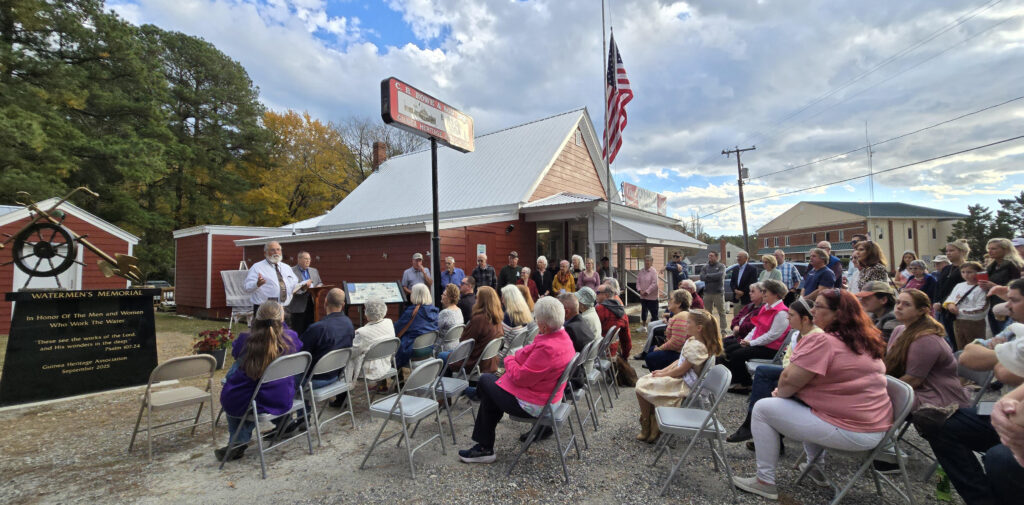 A dedication for Guinea Heritage Association’s new Watermen’s Memorial in front of Buck’s Store Museum in Bena was held Sunday afternoon. The memorial, which features a ship’s wheel and anchor, has been erected in honor of the men and women who work the water. Above, the Rev. Billy West, retired senior pastor of Severn Church, addresses the crowd....