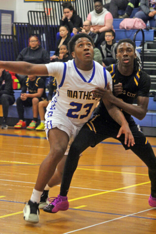 On Friday night, the MHS varsity boys remained unbeaten in the Tidewater District with a 66-50 win on the road against the Pointers. Mathews scored the ball with ease in the beginning of the game as Cosby and Greene commanded the MHS offense. The first quarter ended with Mathews controlling the game, 17-9.