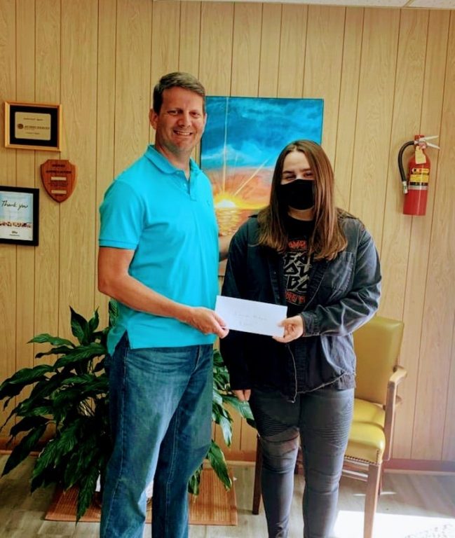 Mathews Insurance Agency presented a pair of $500 scholarships to Mathews High School graduates. Agency owner David Walsh is shown here presenting the Lauren Owens Memorial Scholarship to MHS graduate Lauren Hudgins. Kelsey Ryan (at right) received the Richard Sadler Memorial Scholarship.