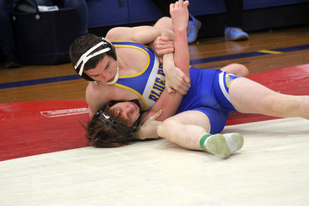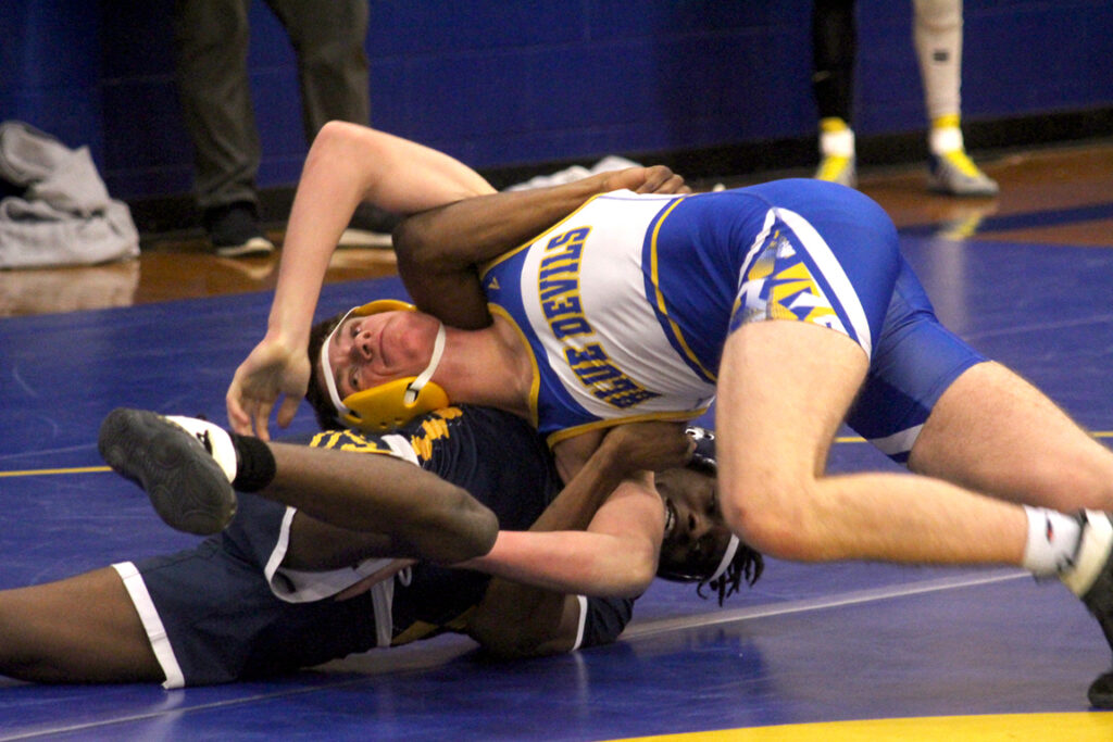 Blue Devil wrestler Jesse Monastyrly controls his opponent in Saturday’s Mathews Invitational.