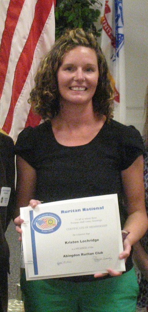 Karen Lawson, above, second from left, was one of three new members welcomed by the Abingdon Ruritan Club at its May membership meeting. Pictured with Lawson are, at left, club president Dave Onesty and, at right, member sponsors Pete and Mary Lou Shepherd. The other new members welcomed this month were, photos below, Kristen Lochridge (sponsored by Bunny Ekdahl) and Bryan Holland (sponsored by Don Sciria).