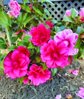 A bouquet of camellia japonica blooms from Lewis Hubbard of Cardinal, from left: April Blush, April Dawn, Black Magic, Margaret Davis, Marie Bracy, Red Ragland Supreme and Romany.