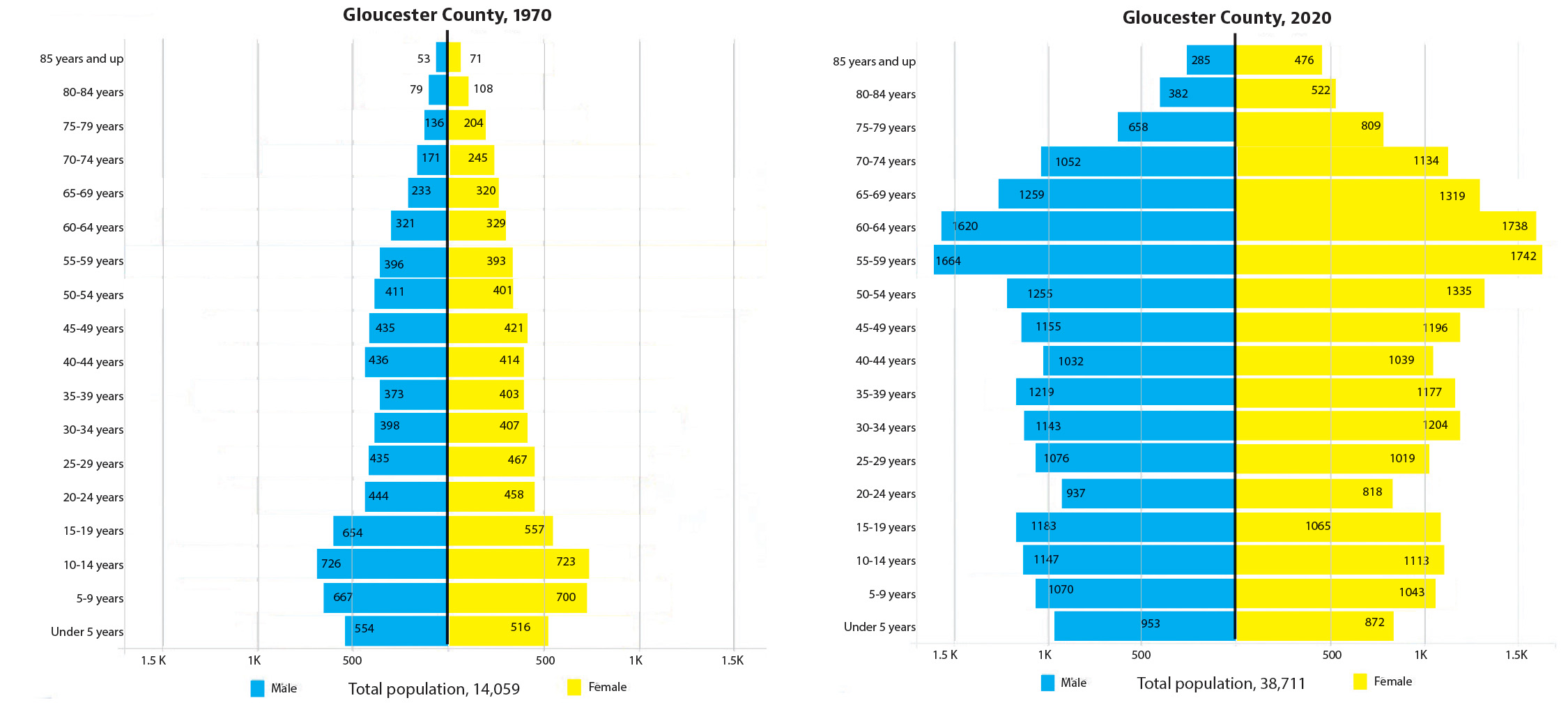 These figures showed higher median ages in Gloucester, Mathews and Virginia, compared to those in the 2010 decennial census; and these figures were much higher than those measured 50 years ago during the 1970 census.