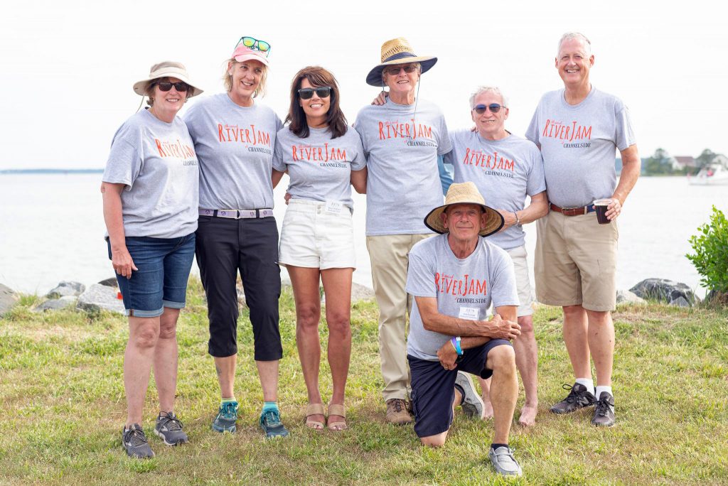 Arts on Main held its fifth annual RiverJam on Saturday at “Channelside,” the Mathews home of Drs. Hugh and Barbara Bryan. A sell-out crowd of over 460 people enjoyed the sunny afternoon of music, food and local brews. RiverJam co-chairs Mike Ivey and Marjo Holthaus thanked the 40 volunteers who helped make the day a success. Above from left are RiverJam committee members Carol Steele, Kathy Andersen, Holthaus, Bill Andersen, Ivey and, kneeling, Walt Evaniak with host Hugh Bryan, at right....