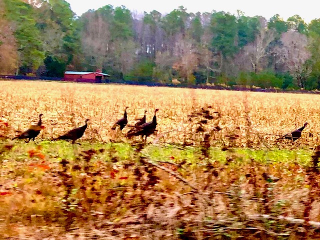 A rafter of wild turkeys makes its way across an autumn field near Elm Grove Lane at North, apparently thankful they had been spared from landing on this year’s Thanksgiving menu....