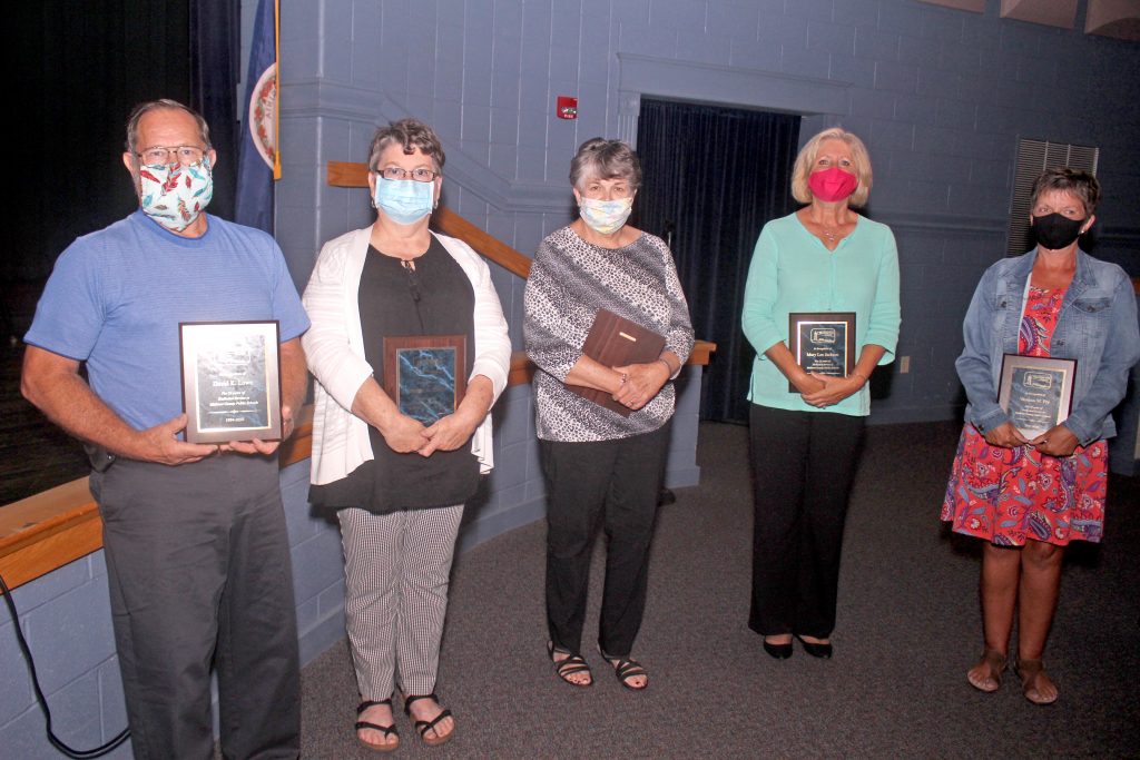 Debbie Hunley (who worked for Mathews schools from 1989 to 2020); Lou Ann Diggs (1992-2020), David Lowe (1994-2020), Martha Barker (1999-2020), Vanessa Fry (2000-2020), Lee Jackson (2006-2020) and Sara Hogge (2007-2020). Each received a plaque and the thanks of the board.