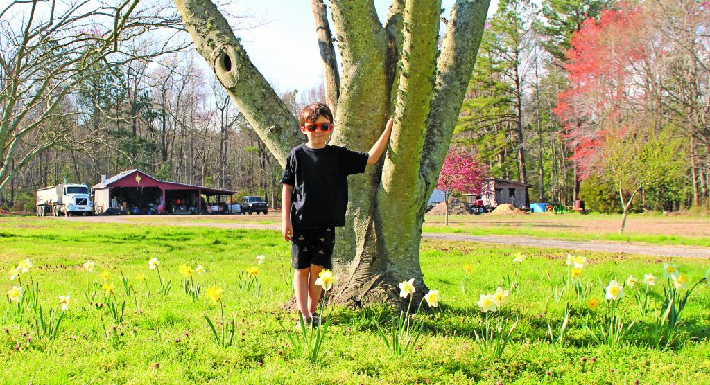 Caden Hutson, a kindergartener at Lee-Jackson Elementary School, stands in a ring of daffodils that circles a tree.