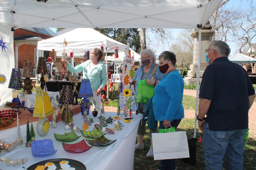 Karen Gellatly, left, of Karen’s Glass out of Richmond demonstrates the effect the sun has on one of her creations as Sherman Roane of King and Queen, right, watches, and Jo Pomponi and Linda Miller of Gloucester examine some of the other pieces.
