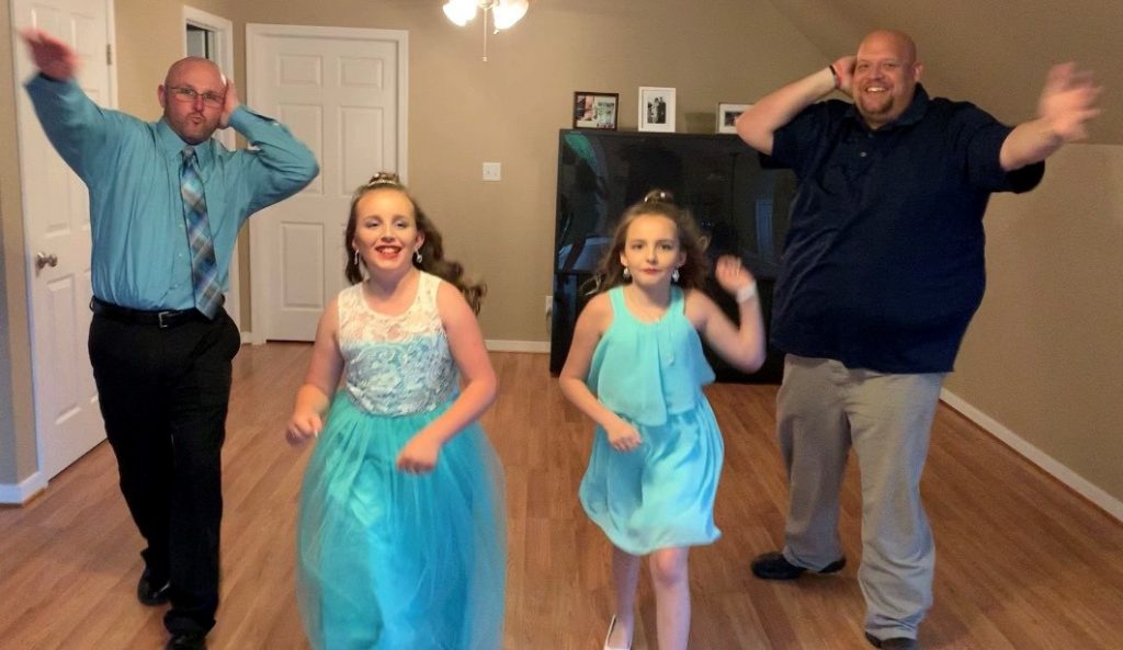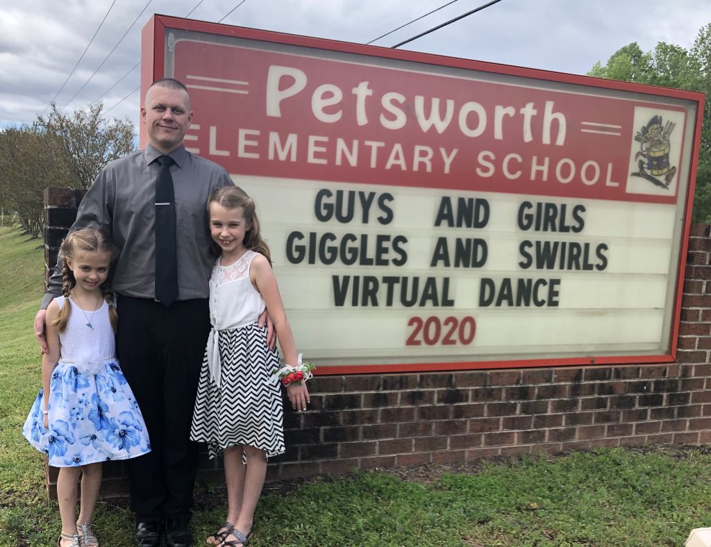 Petsworth Elementary School held a virtual father/daughter dance Thursday and Friday, with participants encouraged to attend at home and share photos with the school afterward. Above, the Mueller family, from left, Kylie Mueller, Kenneth Mueller and Melanie Mueller, visited Petsworth for a photo with the sign advertising the event. Below, Madelyn Rowe and her father Christopher Rowe, at left, and Sidney Miller and her father, Jamie Miller, shared a dance space for the event.